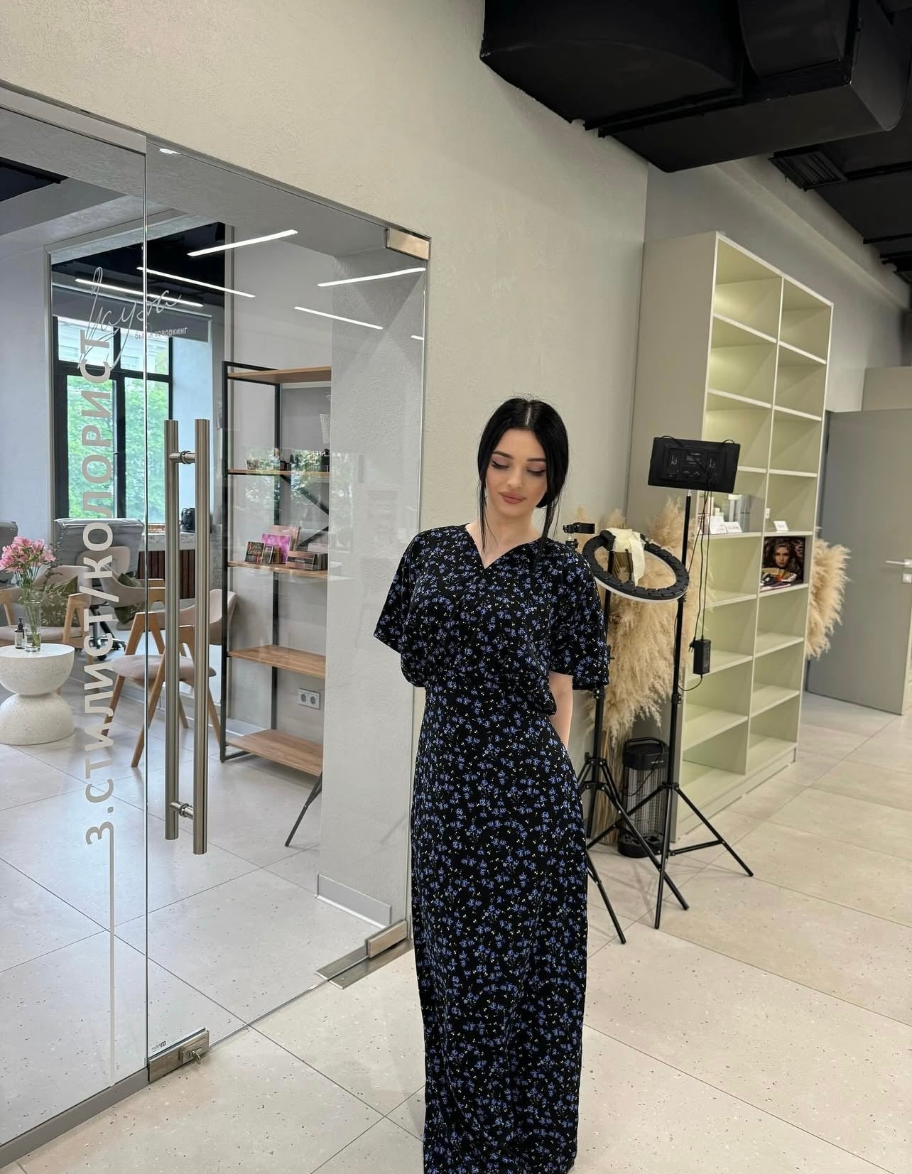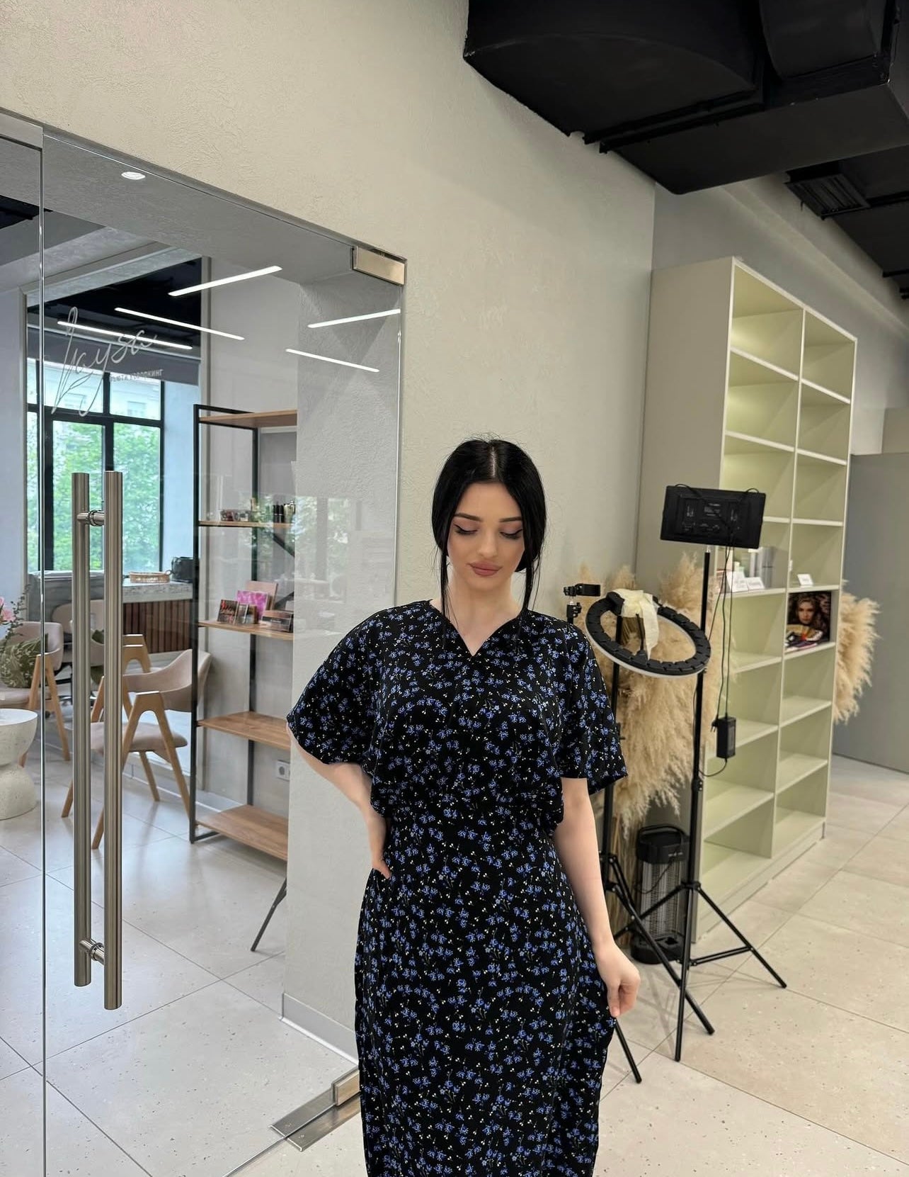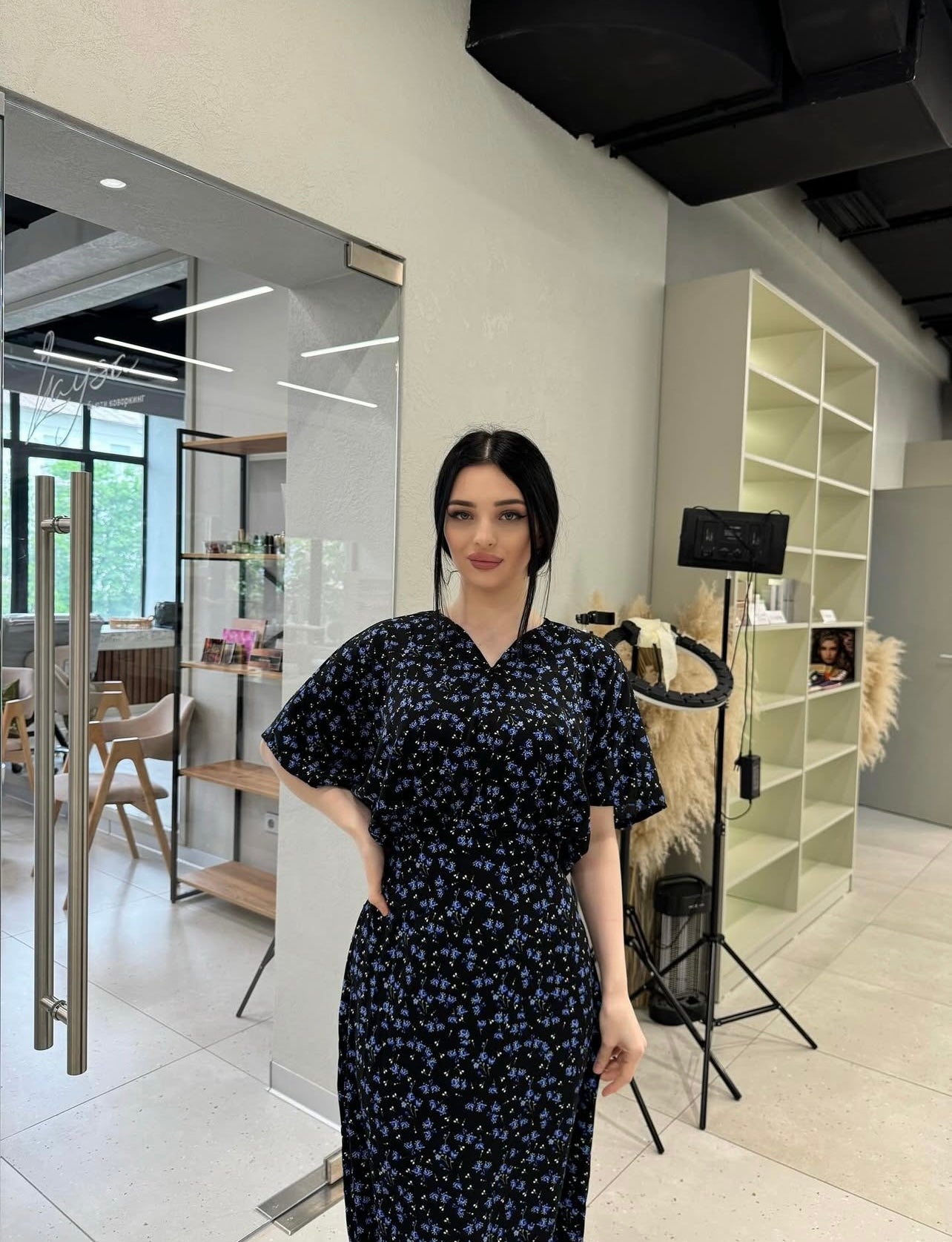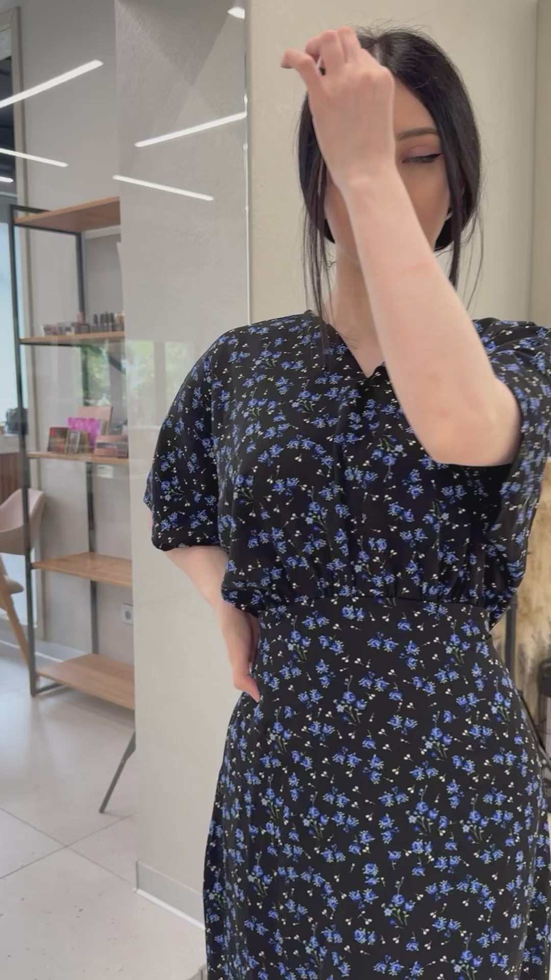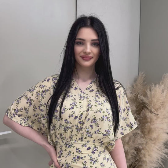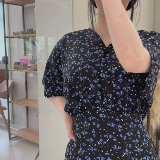 Motif fleuri délicat, manches mi-courtes chauve-souris, encolure croisée et effet bouffant sur la poitrine.