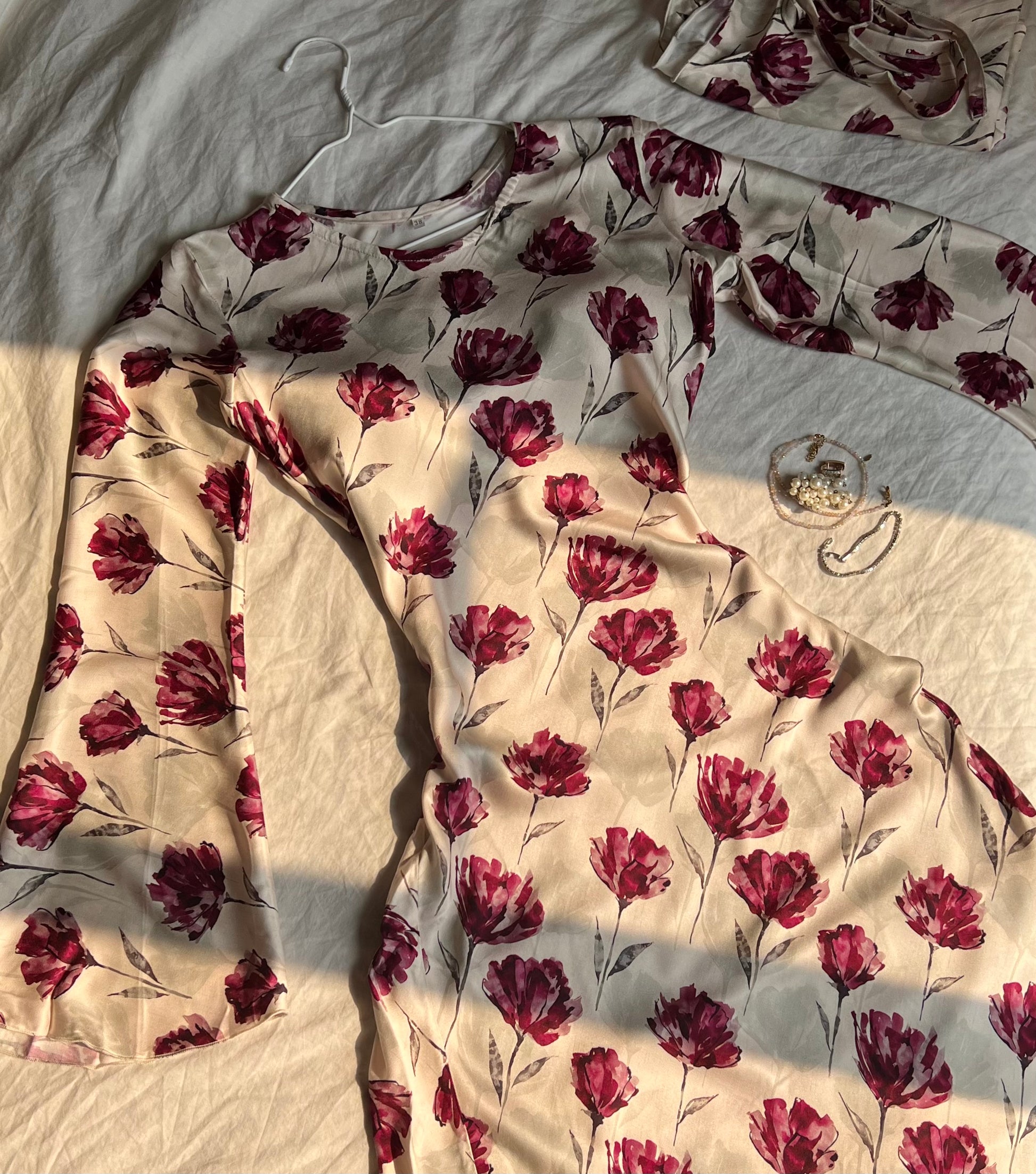Une jolie robe de maison en soie de viscose naturelle, un tissu fluide, doux et opaque. Une coupe biaisée qui épouse élégamment les courbes, cintrée naturellement à la taille, avec des manches subtilement évasées. Consulter le guide des tailles pour choisir sa taille, affiché sur le carrousel photos.